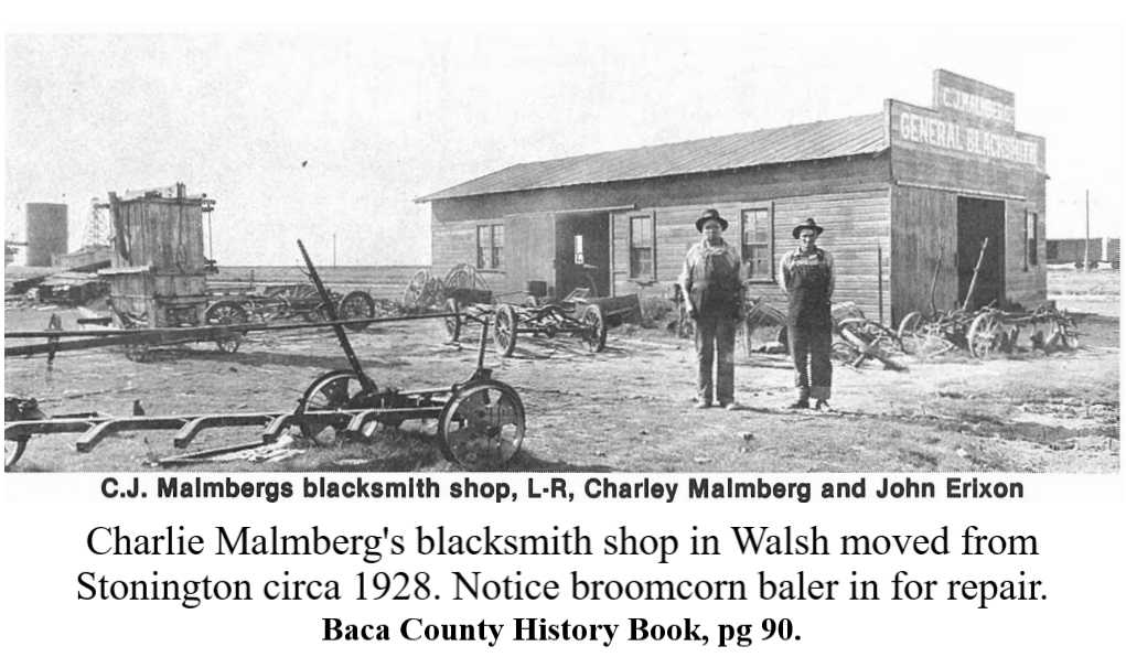 Charley continued to do blacksmithing in Stonington until the Santa Fe Railroad was built in Baca County. Because the Santa Fe Co. offered property and opportunities to residents of Stonington, Charley moved his family and business to Walsh, Colorado. They moved to Walsh in September 1926, and the Malmberg family were the first family to become permanent residents of Walsh.